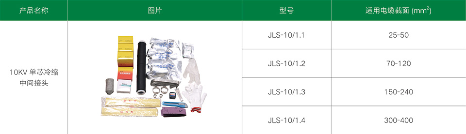 10KV單芯冷縮中間接頭適用于3.6/6、6/10、8.7/10、8.7/15kV單芯聚乙烯和交聯(lián)聚乙烯電力電纜。采用液態(tài)硅橡膠制造,集防水、應(yīng)力控制、屏蔽、絕緣于一體。具有良好的電氣性能和機(jī)械性能,能在各種惡劣的環(huán)境條件下長期使用。具有重量輕、安裝方便等優(yōu)點(diǎn)。廣泛地應(yīng)用于電力、石油、化工、冶金、鐵路、港口和建筑等各個領(lǐng)域。
