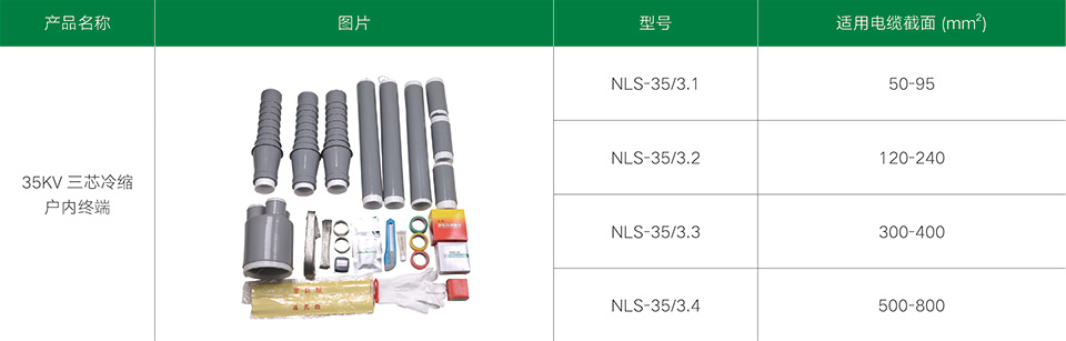 35kV三芯冷縮電纜附件系列產(chǎn)品,適用于21/35、26/35kV三芯聚乙烯和交聯(lián)聚乙烯電力電纜。冷縮電纜附件采用進(jìn)口液態(tài)硅橡膠材料制造而成,不但具有十分優(yōu)良的電氣性能,而且還具有優(yōu)異的憎水性、高彈性、使用壽命長(zhǎng)及恒定的收縮壓力等物理特性。采用冷縮電纜附件,無需明火及特殊工具,只需輕輕抽取塑料支撐條即可,就能自動(dòng)收縮復(fù)位,安裝非常方便于工作。具有良好的電氣性能和機(jī)械性能,能在各種惡劣的環(huán)境條件下長(zhǎng)期使用。具有重量輕、安裝方便等優(yōu)點(diǎn)。廣泛地應(yīng)用于電力、石油、化工、冶金、鐵路、港口和建筑各個(gè)領(lǐng)域。